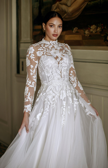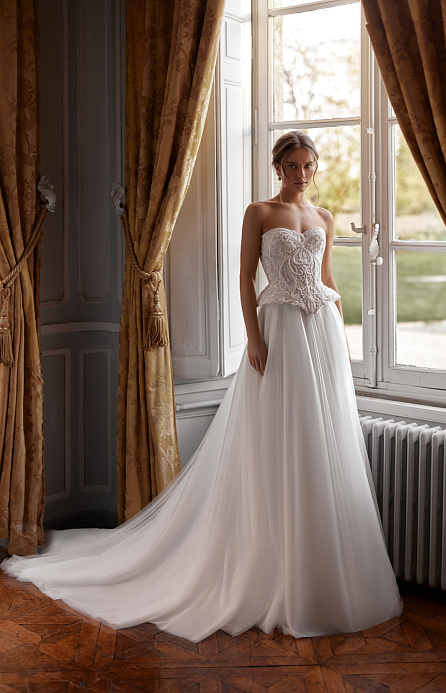 Свадебное платье с многоярусной юбкой и кружевом на корсете