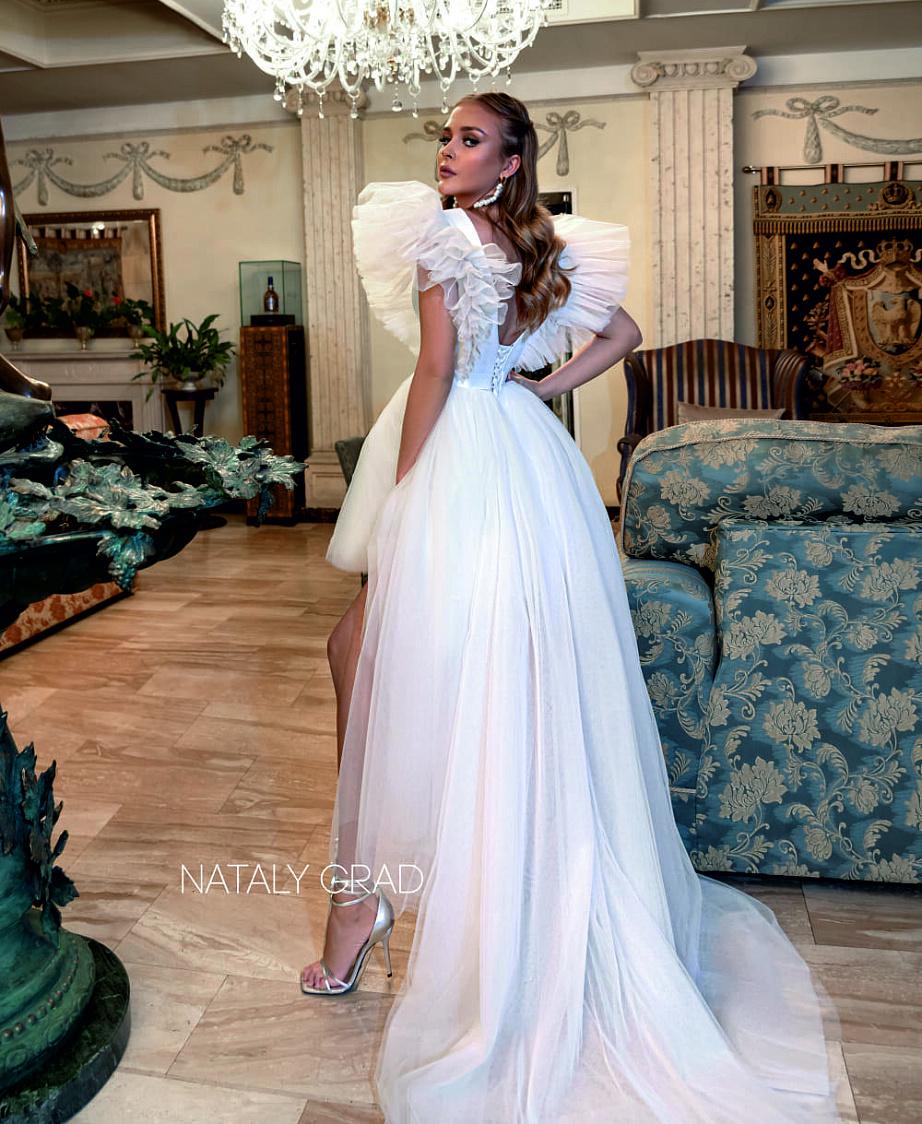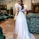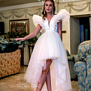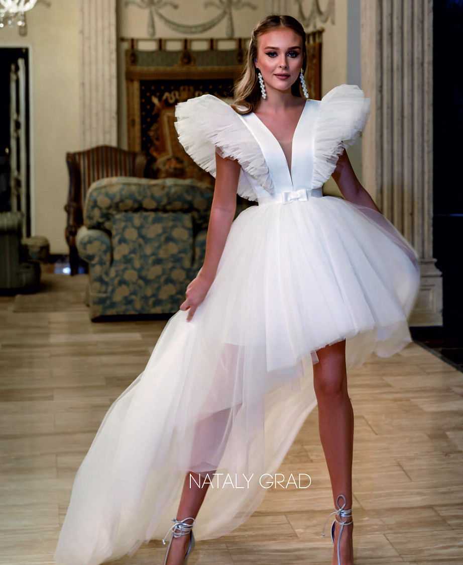 Короткое свадебное платье из фатина со шлейфом
