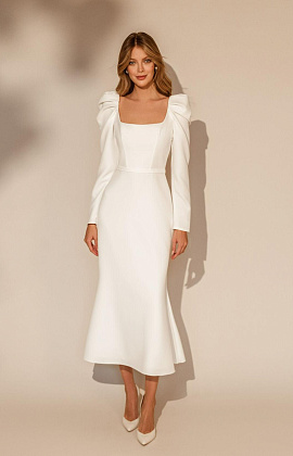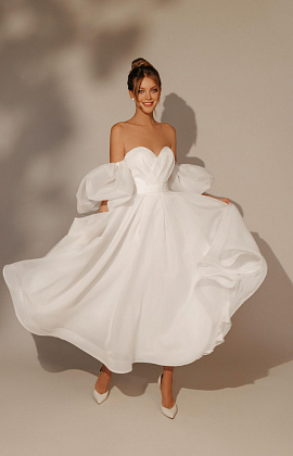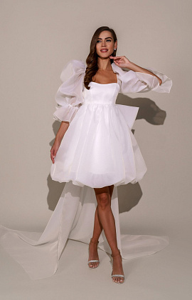 Объемные шифоновые рукава придают образу нежность и романтичность. Талия подчеркнута широким поясом, а грудь оформлена изящным v-образным вырезом. Юбка, как и все платье, выполнена из легкое шифона и оканчивается небольшим шлейфом.