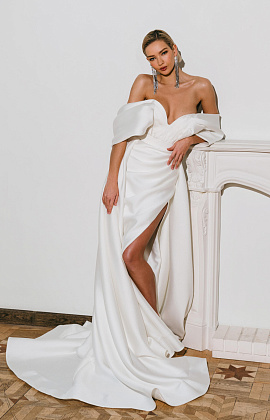 Атласное свадебное платье с разрезом и спущенными плечами
