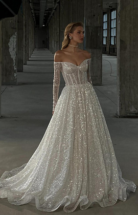 Блестящее свадебное платье с открытыми плечами